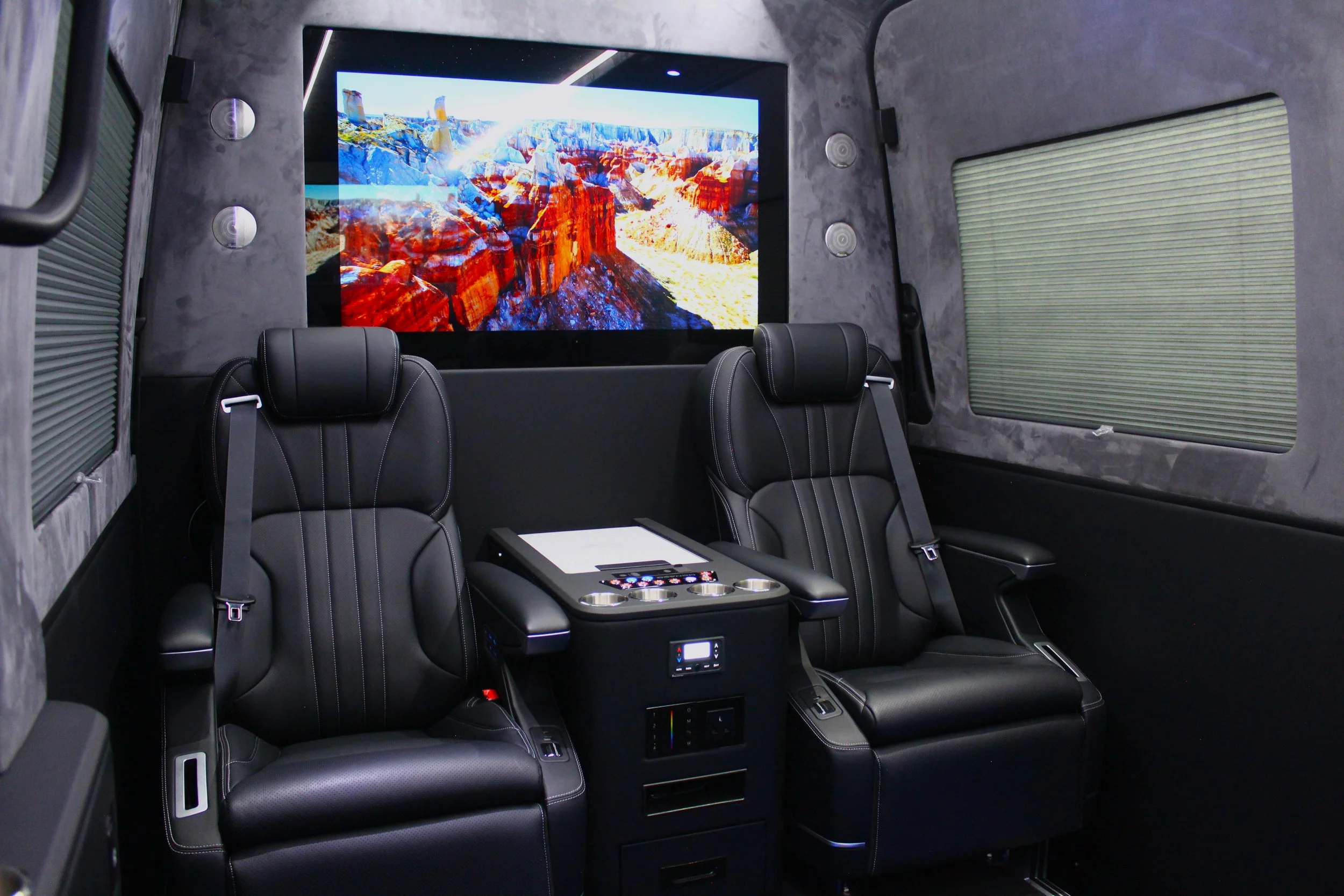 Front centre console housing control panel, cup holders, fridge, lighting controls, plug socket and storage drawer